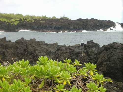 besteht aus einem Mix aus schwarzem Vulkangestein, Pflanzen in saftigem
